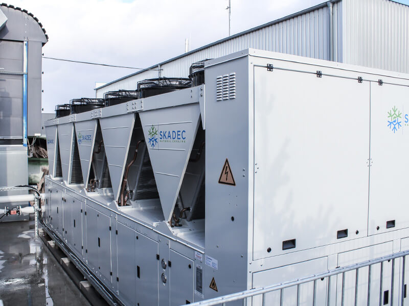 A propane R290 chiller with 230 kW cooling capacity and two refrigeration circuits with free cooling.