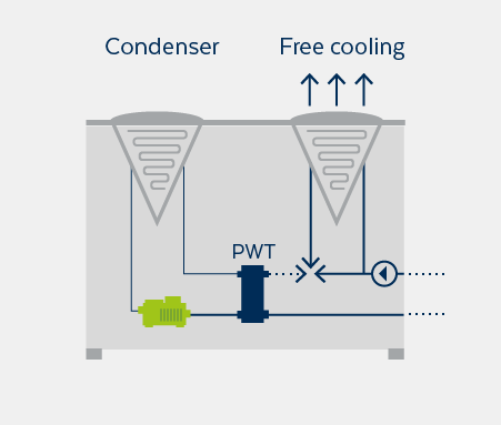 SKADEC-kjølemaskiner kan leveres med frikjøling som tilleggsutstyr. Dette gjør at systemets kompressorer kan slås av ved lave utetemperaturer. Dette betyr at det kun kreves energi for å drive viftene. Kjølemaskiner med frikjøling er derfor spesielt effektive og ressursbesparende.