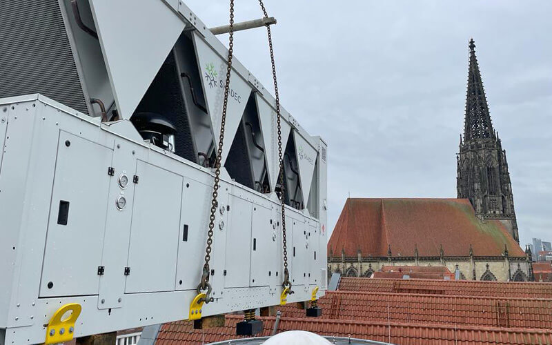 SKADEC lieferte einen luftgekühlten R290 Kaltwassersatz mit vier getrennten Kältekreisläufen zur Außenaufstellung. Zwischen Dom, Lambertikirche und Theater wurde die Anlage mit ca. 5 Tonnen Gewicht mitten in der Stadt auf das Dach des Gebäudes gesetzt. Ein besonderes Augenmerk der Bauherrin lag auf Nachhaltigkeit und Effizienz, weshalb die Anlage mit dem natürlichen Kältemittel Propan (R290) zum Einsatz kam.
