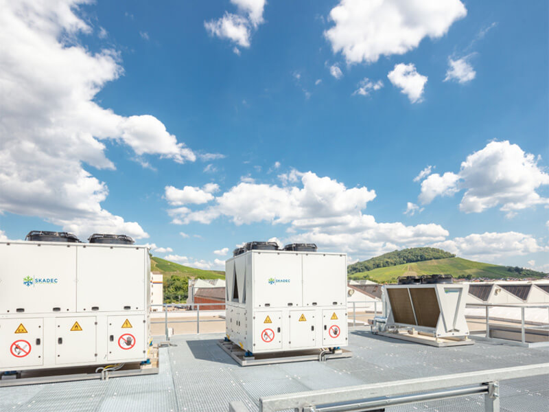 Zwei Kaltwassersätze für die Prozesskühlung mit jeweils 102 kW Kühlleistung und einem externen Freikühler.
